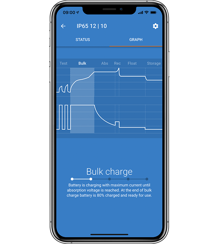 The Blue Smart IP65 is equipped with built-in Bluetooth, so the status of the charger and the battery can be checked on a smartphone, tablet or laptop. All settings of the charger can be configured with the Victron Connect app.