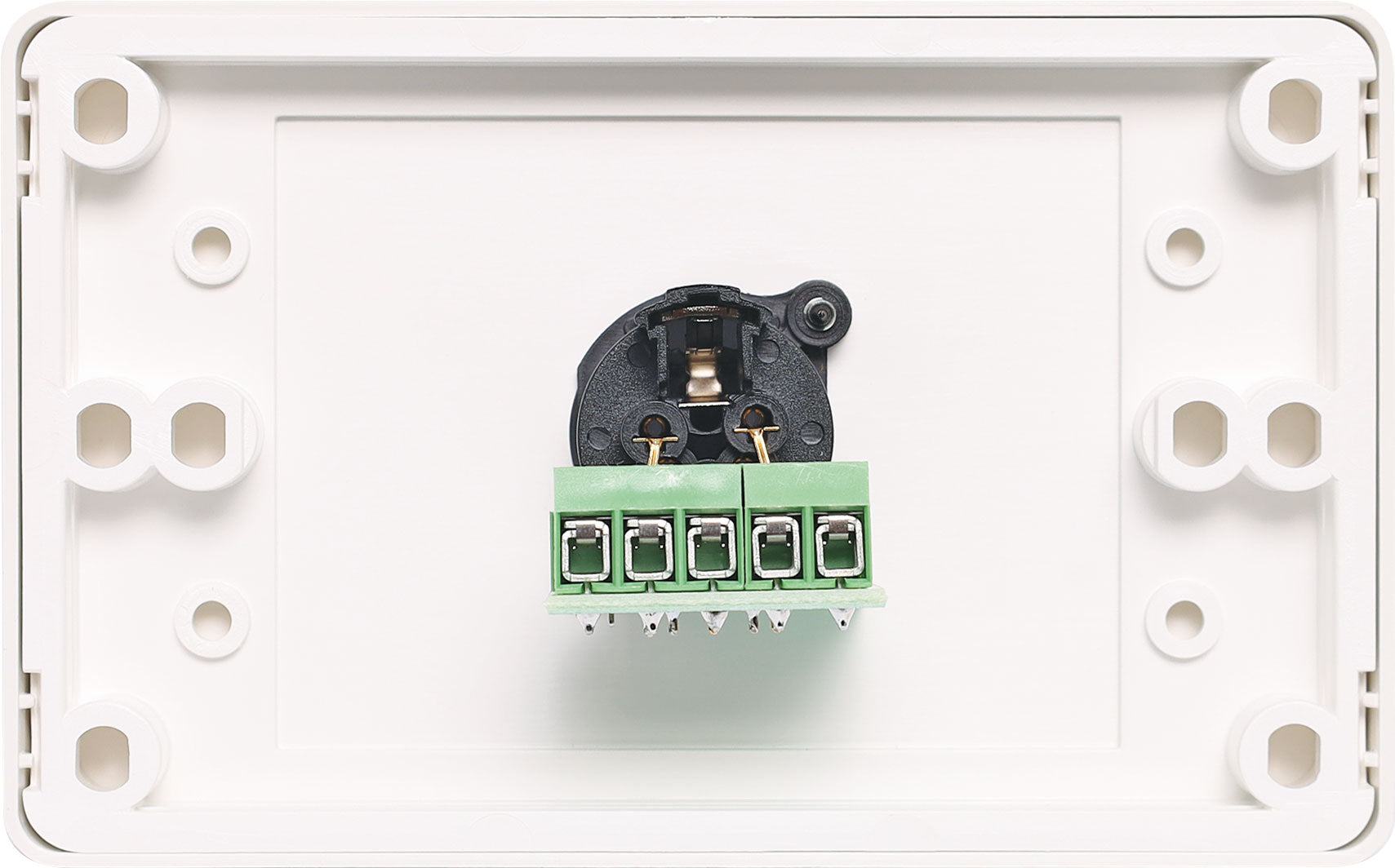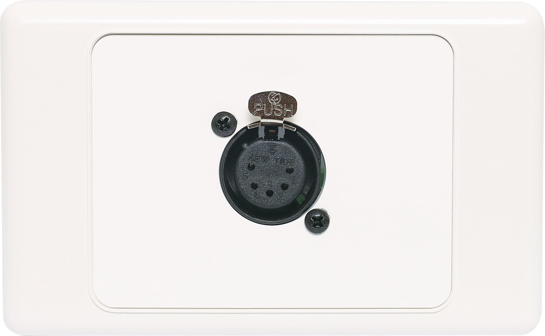 5 pin XLR microphone connector mounted horizontally on a dual face wall plate. “One-Shot” versions with screw terminal connections for quick and easy connection on site.
