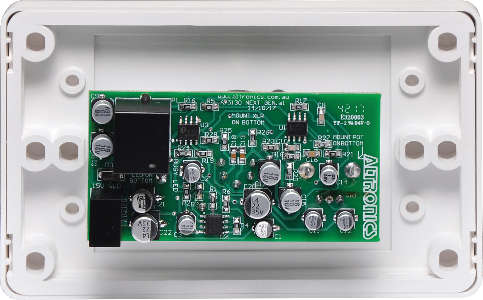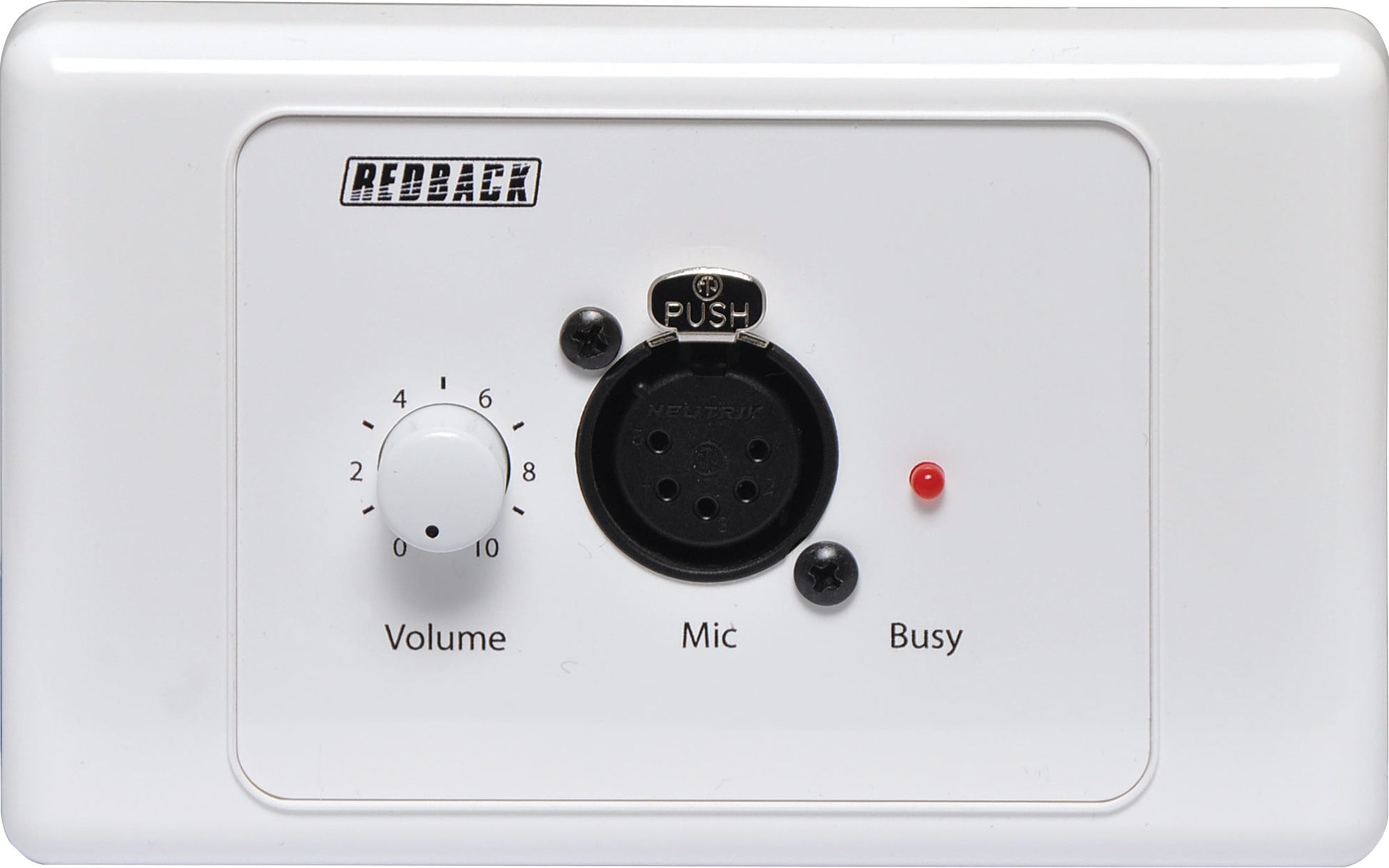 This UTP transmitter wall plate has a standard 5 Pin XLR connector for connection of microphones with PTT switches. This connection is ideal for typical supermarket microphones such as Redback C 0325 or C 0327. The low output level of the microphone is converted to a high level output which is fed down the Cat5 UTP cabling. The output level can be adjusted by the volume control.
