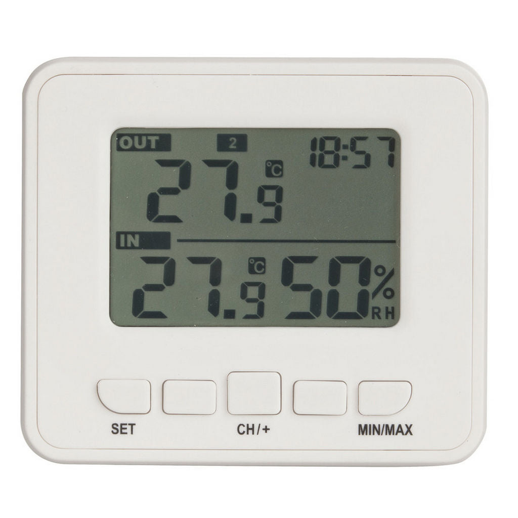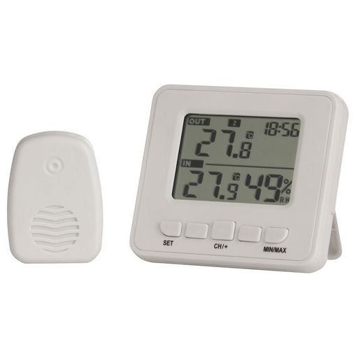 An advanced thermometer/hygrometer capable of measuring indoor and outdoor temperature, as well as relative indoor humidity. The large easy to read LCD acts as a receiver unit for a separate outdoor sensor unit. It will record max and minimum temperatures for quick referral and conveniently displays the time of day.