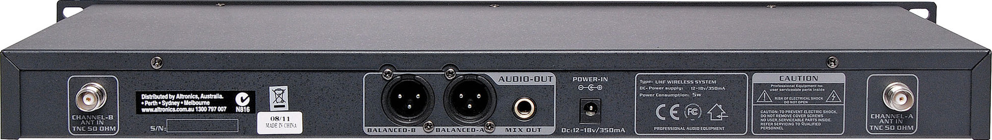 Each receiver features an independent front panel level control, AF, RF and peak indicators. Outputs are provided for each channel via 3 pin XLR, plus a mixed output via 6.35mm jack. The aerials are removable for remote mounting if required. Includes receiver and two handheld microphones. A range of 50m or more is obtainable in ideal conditions. The perfect system for wedding ceremonies, DJs, sporting clubs, schools, restaurants and function centres.