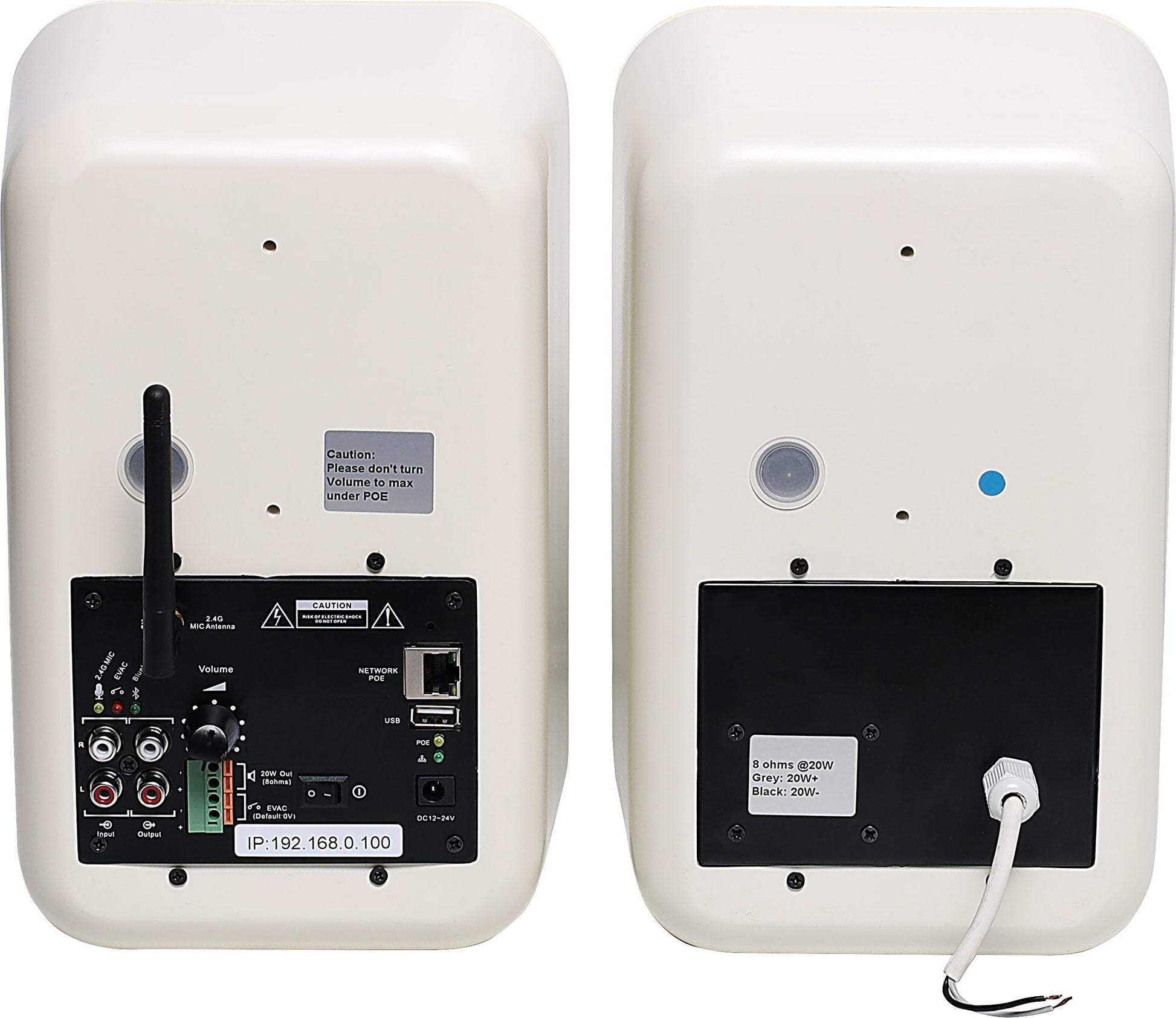 The active speaker has a 2x20W RMS amplifier to provide power to the passive speaker, with RJ45 for connecting to the system network switch, interfacing with the Redback IP PA Communicator. The wireless microphone is USB rechargeable and provides 6-7 hours usage. Stereo RCAs provide connection to local audio source such as a smartboard. A stereo RCA output is also provided for connection into a secondary amplifier within the zone. Speakers include mounting brackets.