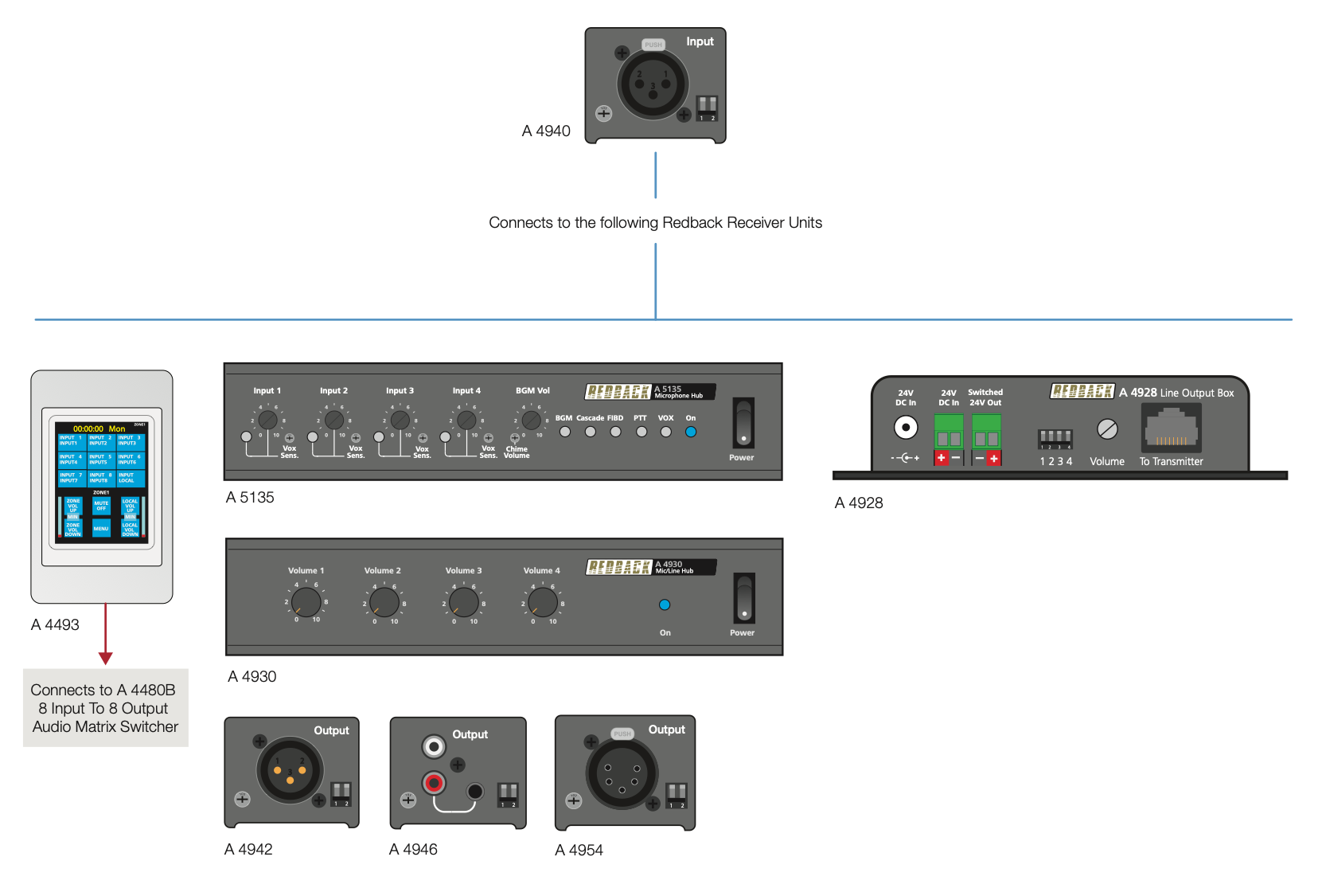 The A 4940 can be connected to compatible Redback products such as the A 4942.